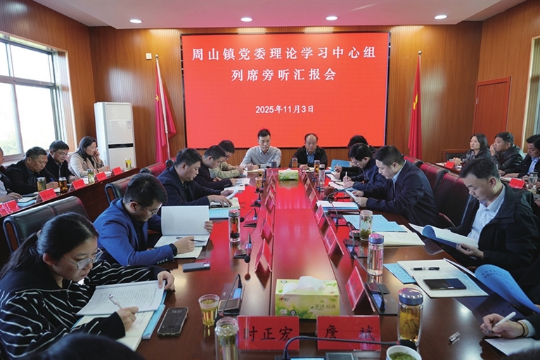 11月3日下午,周山镇召开党委理论学习中心组列席旁听汇报会。市委宣传部副部长、社科联主席周荣池一行到会指导,镇领导班子成员、八办及群团组织负责人、各村(社区)党组织书记参加会议。会议由周山镇党委副书记、镇长李程主持。