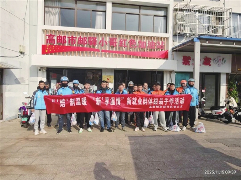 11月15日,高邮镇新联社区党总支、新时代文明实践站在高邮市邮驿小哥红色加油站,为 30多名快递员、外卖骑手等新就业群体举办 “‘焙’制温暖 ‘新’享温情” 甜品手作活动,以甜蜜手作与暖心物资,为他们的冬日增添暖意。