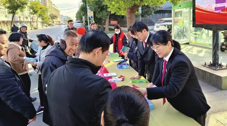在第十二个“12·4”国家宪法日来临之际,4日上午,高邮法院界首法庭联合界首镇司法所,开展宪法进乡村宣传活动,让法律知识与群众面对面。