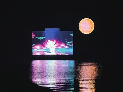 从营地入口进入,多彩的彩虹门率先映入眼帘。沿路而行,形态各异的灯光小品次第铺展,一步一景间,夜游的氛围感已然拉满。在距离岸边180米处,一艘极具未来科技感的多功能演绎船是“湖上升明月”的“移动舞台”。这座“舞台”距离岸边180米,给供电带来了不小挑战。项目施工总负责人王雷介绍,施工过程中,龙腾照明首次将光伏绿色能源作为主电源,通过安装太阳能光伏板,用白天储存的“绿电”供夜晚演绎使用。另外船上还配备了柴油发电机,能充分保障演绎的电能供应。整个控制系统实现了“一键启动”与“实时监控”的智能化管理。