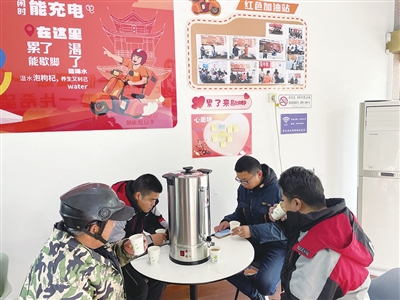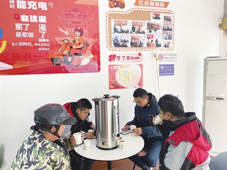 为加强对新就业群体的关心关爱,近日,龙虬镇龙虬社区推出“一杯暖心茶”服务,为新就业群体提供姜枣茶,驱散冬日骑行的寒意,让这份关怀直抵心底。图为“小哥”们在“红色加油站”体验暖心服务。