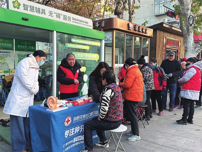 15日上午,市红马甲志愿者协会联合相关医疗机构组织开展便民义诊服务,免费帮助社区居民测血压、血糖等,受到大家点赞。图为义诊现场。