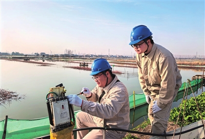 16日,市供电公司临泽供电所员工前往临泽镇周巷村大闸蟹育苗基地,检查池塘里的电力增氧泵及断路开关,保障塘口在寒流低气压天气情况下安全用电。图为检查现场。