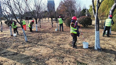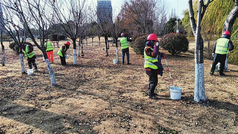 近日,市城管局组织环卫工人对城区主次干道两侧的树木进行涂白作业,防控低温冻害和病虫害,保障绿化树木安全越冬。图为作业现场。
