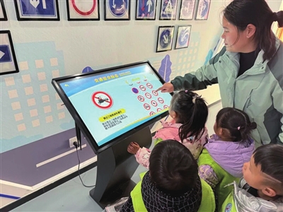 近日,三垛幼儿园组织幼儿们走进三垛小学交通安全情景教育基地开展研学。孩子们在校长的引导下探索情景模拟区,听讲解员讲解交通标识与规则,并通过扮演司机、行人、交警等角色模拟,体会到遵守交规和礼让行人的重要性。图为活动现场。