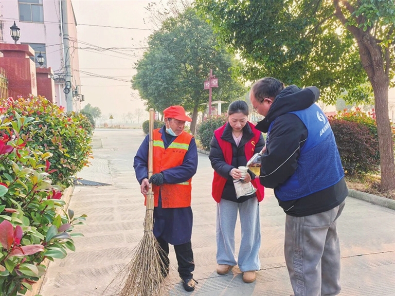近日,卸甲镇三新村党总支组织开展“冬日送温暖”姜枣茶慰问活动,志愿者与网格员熬制出热气腾腾的姜枣茶,及时送到正在清扫道路的保洁员手中。