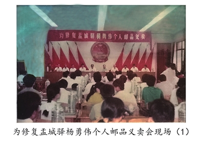 1993年6月29日下午,来自扬州、泰州、仪征、兴化等地的邮友与高邮邮友纷纷冒雨赶赴高邮市政府第一会议室,参加“为修复盂城驿杨勇伟个人邮品义卖”活动。那时,邮市开始冷寂,但拍卖现场气氛热烈,90多项邮品全部成交,有一项邮品竞价达21次。