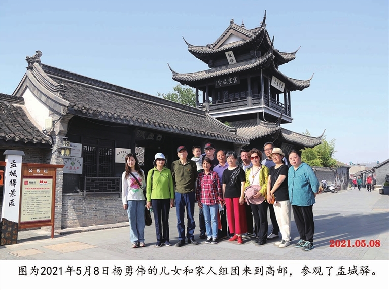1992年春天,杨勇伟应邀来邮指导高邮集邮爱好者编组邮集时,知悉高邮有座古驿站盂城驿。当看到坐落在他当年攻打高邮城南门附近的盂城驿的景象时,他动情地表示:“修复盂城驿,是我革命生涯中的最后一战!”