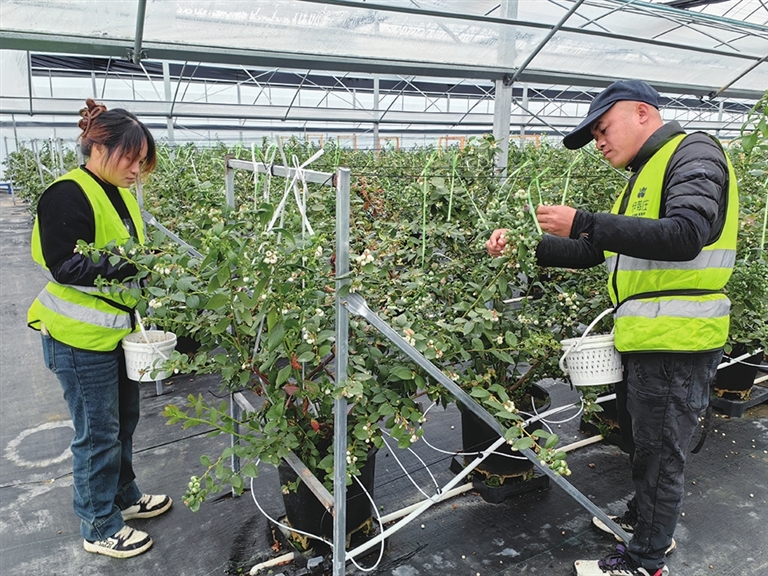 “当下正是大棚蓝莓上市季节,目前蓝莓每斤能卖到60元左右,而且市场供不应求。”日前,位于卸甲镇农科园区内的盛蓝农业科技蓝莓种植项目负责人欣喜地表示。据了解,该项目总占地面积300亩,目前已累计建成蓝莓大棚10万平方米,采取水肥一体滴灌系统和科学管理,不仅提高蓝莓产量,而且使果实品质得到保证。图为员工正在进行蓝莓疏花管理。