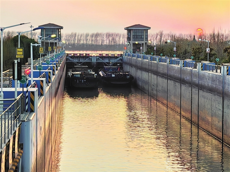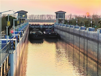 截至12月24日,运东船闸今年以来已累计安全开放5988个闸次,放行各类船舶22264艘,货物通过量1020.1万吨 ,为里下河地区生产生活物资供应提供了重要的服务保障。图为运东船闸运行现场。