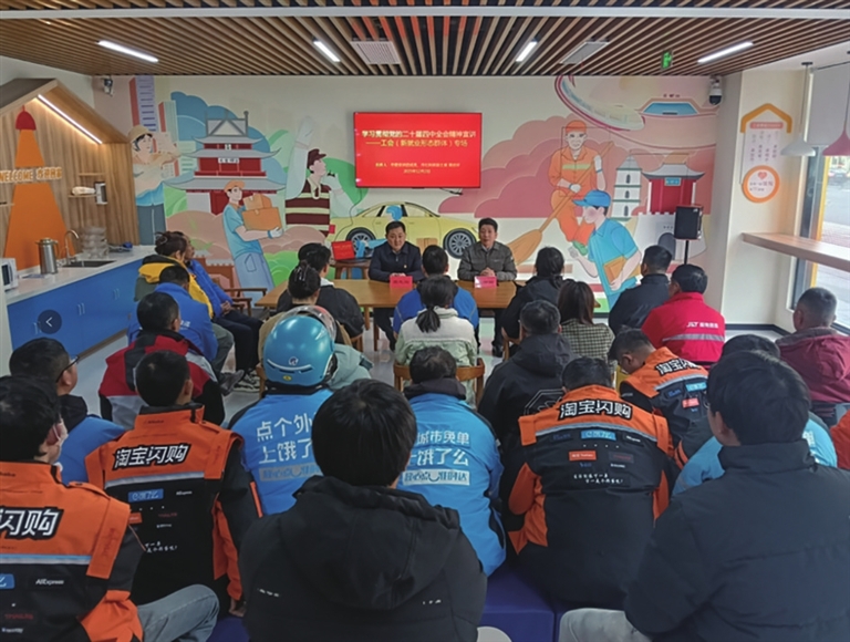 12月2日下午,市总工会组织淘宝、饿了么、极兔等30余名新业态从业者在市工人文化宫工会驿站,举办党的二十届四中全会精神宣讲活动。