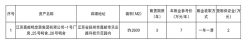 经有关部门批准,江苏高邮鸭发展集团有限公司定于2026年1月7日下午3:30 在扬州市公共资源交易中心高邮分中心网站对以下厂房、鸭舍进行网上公开招租:(见附件)具体招租细节及要求请参见招租单位招租公告(公告发布网址:http://ggzyjyzx.yangzhou.gov.cn/gyfzx/ 产权交易)。