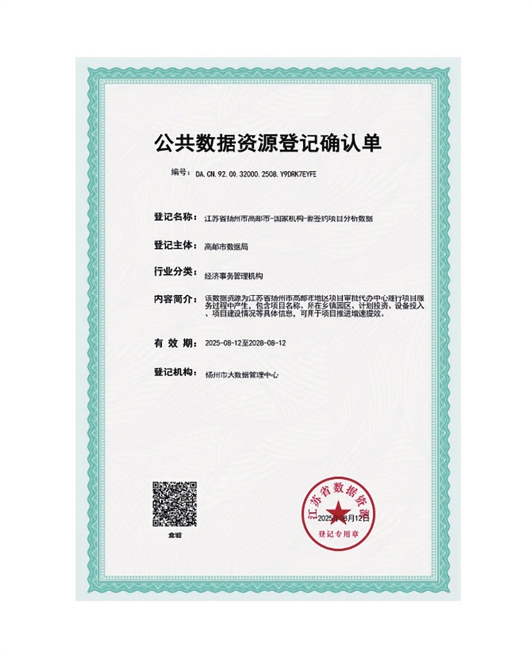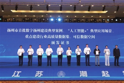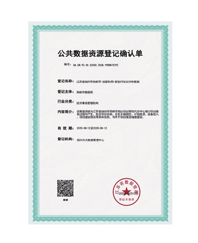 二、数据要素价值加速释放。开展数据攻坚行动,推动20个部门540条公共数据资源在省平台完成登记,完成1170个政务数据目录编制、上报数据约1255万条;获得8个国家级数据接口、216个省级数据接口和1个扬州市级数据接口回流,实现身份证、户口簿、营业执照等高频证照省内精准调用。统筹推动各领域数据资源开发利用,完成25个数据产品登记,高邮鸭蛋、高邮大虾、盂城驿景区等数据产品在深数所上市交易并亮相全国首批地理标志数据产品集中上市仪式,“海潮净水综合数据集”等国有企业数据产品和航天锂电、毕方等民营企业数据产品在省数交所挂牌上架,实现扬州民营企业数据产品“零的突破”。开展数据资产证券化探索,高邮智慧停车数据集等8项数据资产预计融资9000万元,新源水务落地首笔数据资产质押融资1200万元。挖掘培育“数据要素×”“人工智能+”应用场景,形成5大类55个数智化应用场景矩阵。全市数据产品数量、上市交易额、授信融资额均位列扬州首位,9项成果入选首批数字扬州建设成果。