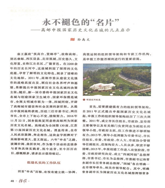| 《征程》第3期刊登孙禹文副主席《永不褪色的“名片”——高邮申报国家历史文化名城的几点启示》署名文章。 |