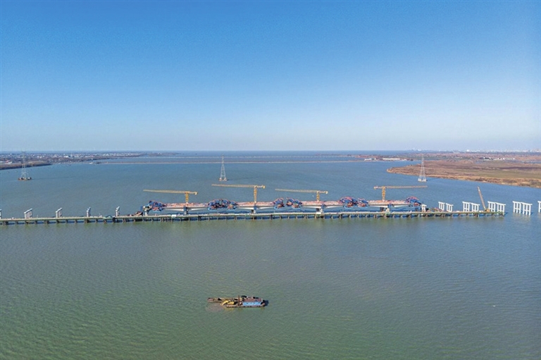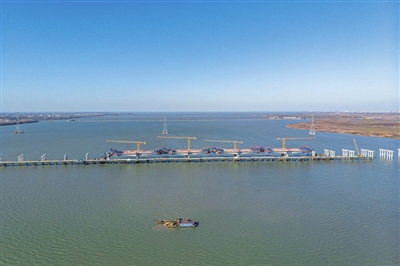 | 高邮湖特大桥正在进行跨淮河入江水道悬浇梁施工 |