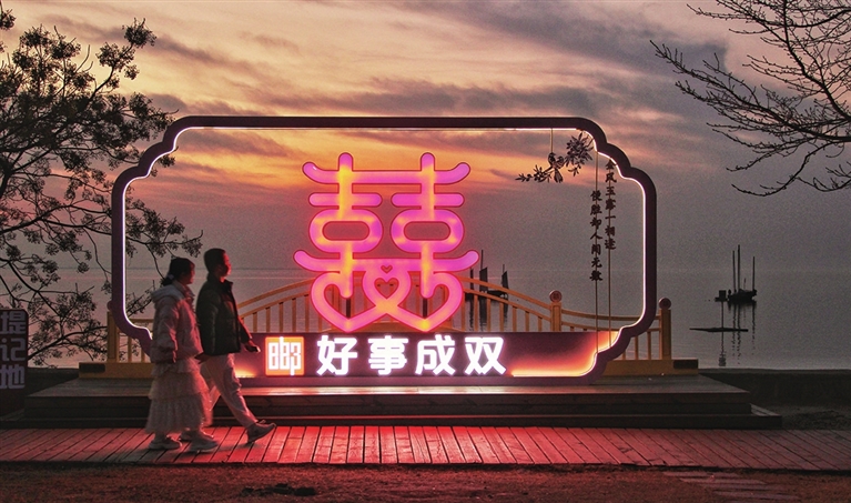 黄昏时分,在运河西堤高邮湖畔,巨型“囍”字装置与帆船景观相映成趣,成为独特的浪漫地标,吸引了许多本地居民与外地游客前来打卡。 居卫峰 摄