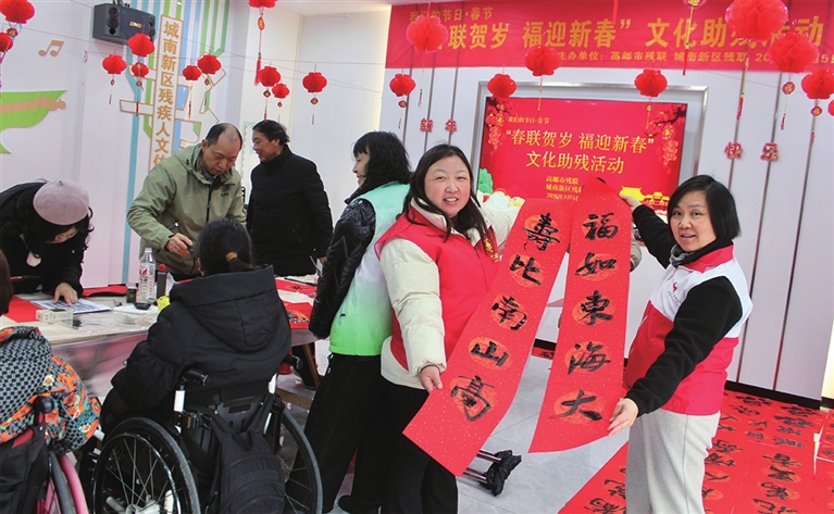 新年将至,年味渐浓。5日,市残联联合城南新区残联组织开展“春联贺岁 福迎新春”文化助残活动,邀请残疾人书法爱好者与特邀书法老师同台挥毫、执笔寄情,让残友们在喜庆的氛围中迎接新年的到来。图为活动现场。