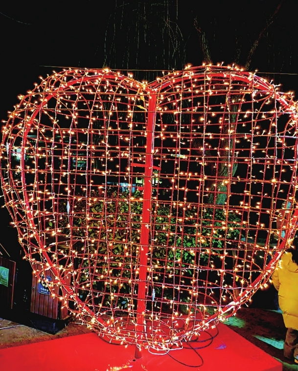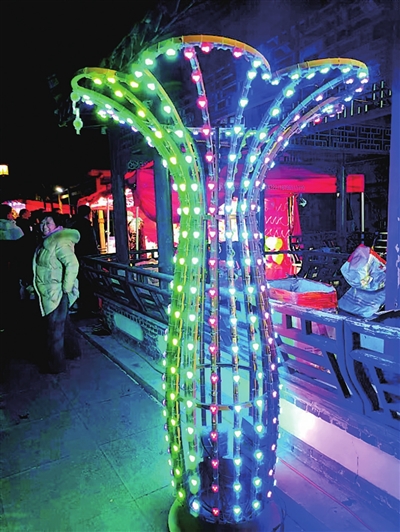 灯会的晚上自然少不了踩街的队伍。舞龙、跳狮子、挑花担、荡湖船、踩高跷、大头娃娃舞,传统文艺样式,老百姓常看常乐,百看不厌。还有小学生的鼓号队,成年女子的腰鼓队,鼓声整齐,富有节律,给人听觉的审美享受。最吸引人的是一辆大卡车装载的一只巨型大鼓,四个壮汉,头扎纶巾,身着彩衣,手执双槌,一齐抡圆了臂膀击打,大鼓发出低沉的钝响,声波强烈,撼人心魄。灯会的晚上,满眼的色彩斑斓,满世界光怪陆离,街市上人如潮涌,半空中火树银花,共同抒写着盛世繁华。