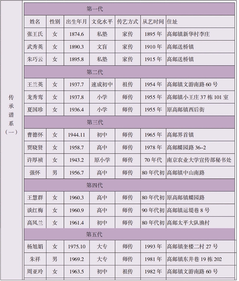 (三)高邮民歌的传承谱系。千百年来,高邮民歌的传承已形成谱系。高邮民歌的传承方式主要是口口相传,老歌手教新歌手,代代相传,生生不已。已知的传承谱系各代传承人为: