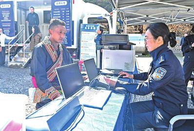 唐超 汤淞 四川法治报全媒体记者 张磊 马超 文/图 10月30日,绵阳市公安局交通警察支队将交管服务直通车开进平武县白马扒昔加古寨,为周边乡镇群众送来家门口的车驾管服务,切实解决偏远地区群众“办事远、办事难”问题。现场搭建高效有序 便民阵地快速成型 当日13时,扒昔加古寨广场早已热闹起来。车管所的民警们带着全套设备抵达现场,分工协作搭建临时办理点:蓝色帐篷稳稳撑起,塑封机、打印机、电脑等设备一字排开,有条不紊地完成调试;交管服务直通车接驳电源后,车厢内的电子屏随即亮起,滚动播放着通俗易懂的交通安全知识;另一侧,自助体检机成功连接医院和公安业务后台,随时准备为群众提供体检服务。 看着眼前整齐的办理工位和忙碌的民警,路过的村民和游客纷纷驻足询问,不少人立刻回家取来相关材料,准备趁着这个机会解决积压许久的车驾管难题。便民服务解民忧 村民难题当场办理 临时办理点内,各业务区域分工明确、高效运转。驾驶证期满换证、遗失补证、机动车行驶证补换领、号牌补换领等业务都可以在此办理。 帐篷前的空地上,民警正利用便携式电子称对一辆三轮摩托车进行称重查验。“农村地区有很多这种拉货载物的三轮摩托车,就拿白马镇来讲,以前群众上牌要去80公里外的平武县城的车管所,来回成本高,还耽误时间。许多群众觉得麻烦就不想上牌照了,这也带来了很大的交通安全隐患。”现场民警告诉记者,“现在,我们把车管服务直通车开到村寨里,还带了便携设备对车辆进行现场查验、受理上户业务,群众手续资料齐全的情况下,3个工作日内就能把新牌照寄递到群众家里。如此一来,整体提高了摩托车、电动车的上户率,从源头夯实了道路交通安全基础。” 在现场,白马藏族乡亚者造组村村民杨勇很顺利地拿到了崭新的驾驶证。“我的驾照丢了有一段时间了,虽然有电子驾照,但始终觉得少点踏实感。”杨勇说,这段时间枫叶红了,自家民宿生意火爆,每天忙得脚不沾地,根本抽不出时间去县城补办证件,“今天一早看到村上通知交警上门服务,我赶紧放下手里的活赶过来,只用带身份证,10分钟就办好了,一点不耽误做生意”。降证背后藏“新篇”红火日子从家开启 “警官,我想把我的B照降成C照!”在业务办理窗口前,村民陆开修的申请引发了周围群众的好奇。民警仔细查验其B2驾驶证状态正常、符合自愿降级条件后,仅用10分钟就为他办好并发放了全新的C1M驾驶证。 “德姆拉勒!(白马藏族语:吉祥如意!)感谢警察同志,真是又快又方便!”拿到新驾照的陆开修,用家乡话向民警表达谢意,话语间满是对未来生活的憧憬。谈及降证的原因,陆开修打开了话匣子:“我是2008年考的B证,当时是为了开货车跑运输谋生,那些年常年在外奔波,还是辛苦。” 而如今,随着乡村振兴战略的深入推进,家乡的旅游资源被不断发掘,政府也大力支持村民发展民宿产业。“现在家乡发展越来越好,我也不跑长途运输了,我家的民宿马上就要开业了!”陆开修笑着说,B证对他来说已经用不上了,换成C照足够日常出行使用。“降证不是退步,而是我红火日子的新开始!留在家里经营民宿,既能照顾家人,又能跟着家乡发展的脚步致富,我对未来充满信心。”宣传服务同步走 便民技能送到手 在提供高效业务办理的同时,交管服务直通车同步开展交通安全宣传与咨询服务。业务咨询台前,民警耐心解答群众关于交通违法查询处理、事故处理流程、车驾管政策等方面的疑问。宣传教育工作中,民警向过往群众发放交通安全宣传资料,结合本地典型案例讲解“一盔一带”、酒驾醉驾的危害,进一步提升群众的交通安全意识。 “只要有4G网络信号覆盖、服务车能到达的地方,我们就能把车管服务送到群众身边。”绵阳市公安局交通警察支队车管所所长杨栋表示,今年4月,绵阳公安交警部门联合绵阳邮政推出车管服务直通车,打破了4G移动信号与公安业务系统不能互通的瓶颈,实现了“流动车管所”全域可达、服务随身。