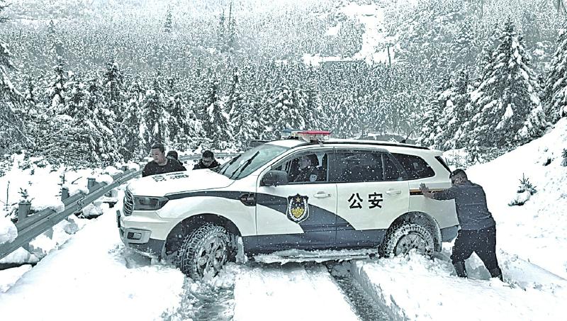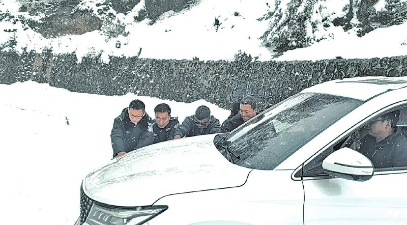 警车被困在雪坑中,群众帮助“云上中队”民辅警一起推车