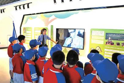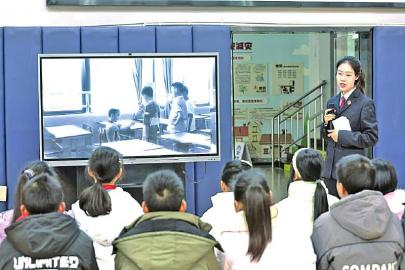 “小鲟”老师胡庆为在宜宾市青少年法治宣传教育实践基地参加法治“巡游”的学生讲解