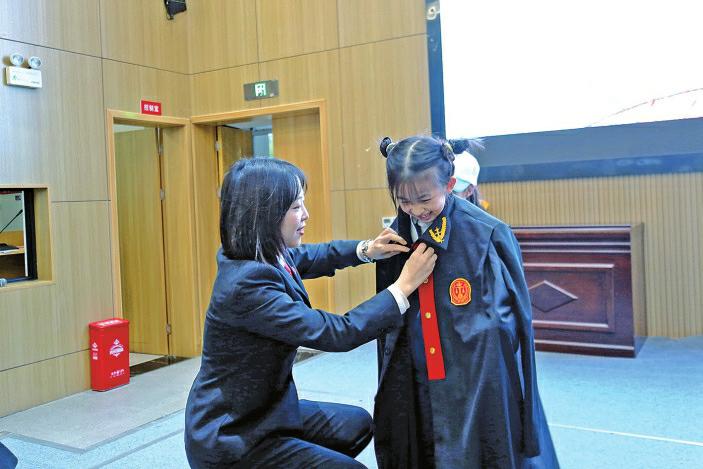12日,四川中小学生首个秋假开始的第一天,宜宾市翠屏区法院迎来了一群小客人——辖区3所学校的500余名小学生,法院特地联手宜宾科教投资产业集团有限公司开展青少年法治研学活动,为孩子们的首个秋假注入厚重法治底色。法官立足小学生认知特点,向同学们详细讲解法院与法官的职责和法徽的构成与意义。针对校园欺凌等热点问题,通过还原真实案例,剖析刑法、民法典等法律规定,提升他们的自我保护意识和能力。法官还邀请孩子们穿上法袍、走上审判台、敲响法槌,感受法律的神圣和审判的威严,在他们的心中种下法治种子。