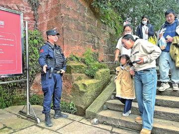 12日,乐山大佛景区迎来秋季旅游热潮,当日景区共接待游客20740人次(含游山游客14418人次、游江游客6322人次)。面对客流高峰,乐山大佛景区公安分局启动高等级勤务模式,通过“高密度全覆盖”的立体化防控体系,全天候开展巡逻防控、应急处突、秩序维护及游客服务工作,累计处置游客求助、帮扶等事项200余起,全力保障游客“游得放心、玩得舒心、行得顺心、赏得开心”。 伍永杰 彭屏 四川法治报全媒体记者 李欣璐 文/图