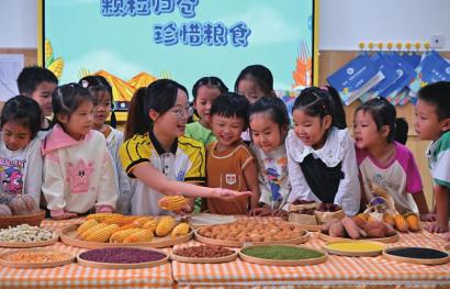 10月15日,眉山市仁寿县城北幼儿园开展“珍惜粮食”主题活动,孩子们在老师的指导下通过辨认玉米、大豆、稻谷等五谷杂粮,增强爱粮、惜粮的好习惯。 图为老师正在指导小朋友辨识五谷杂粮。 特约通讯员 潘帅 摄
