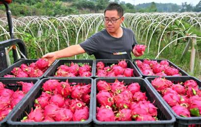 近年来,仁寿县怀仁街道采取“党支部+合作社+农户”的抱团模式,规模化发展火龙果、樱桃等特色水果产业,通过统一品种、统一管理、统一销售,助力土地增效,村民增收。 图为10月17日,果农正在转运火龙果。 特约通讯员 潘帅 摄