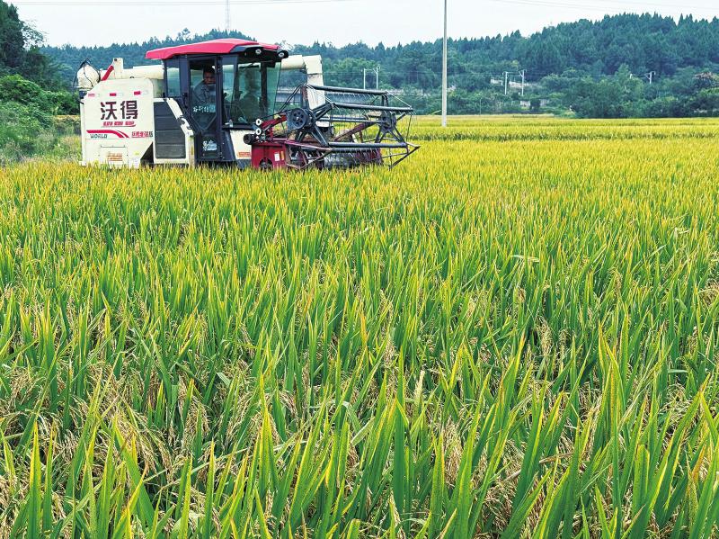 金秋十月,稻谷飘香。10月16日,在绵阳市涪城区新皂镇梅家沟村千亩稻田里,收割机沿田垄穿梭,收割、脱粒、碎秆一气呵成,脱粒稻谷经机械直装运输车辆,全程高效有序。