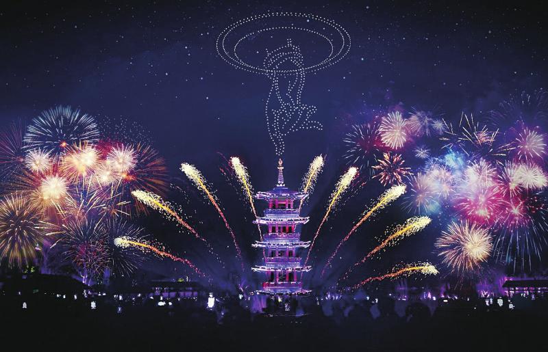 夜幕降临,江苏无锡拈花湾景区内,一座高约25米的AI塔被点亮,1500架无人机腾空而起。光影与水雾交织,夜空化身“奇幻剧场”,游客纷纷举起手机,惊叹声此起彼伏:“这简直像在看科幻大片!”