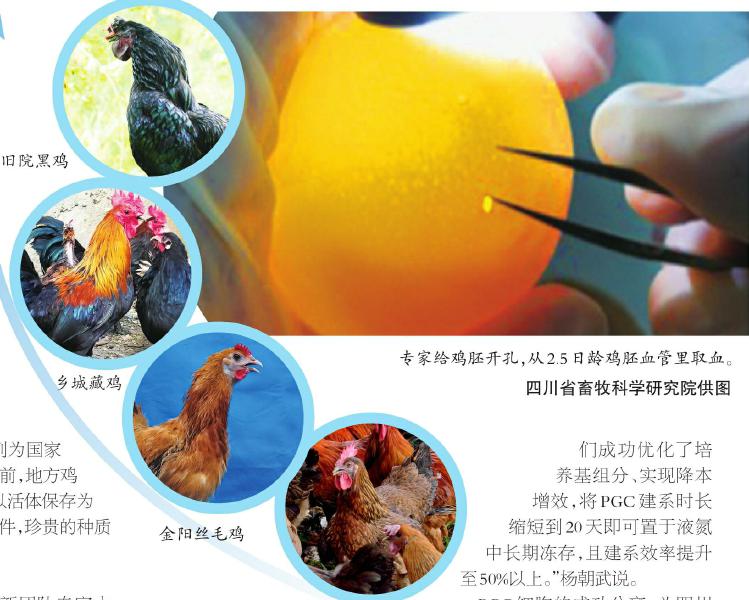 怎么办?“依托四川鸡创新团队专家力量,我们加快了PGC细胞分离技术攻关,以护航四川地方鸡产业健康发展。”四川鸡创新团队领衔专家、四川省畜牧科学研究院院长杨朝武介绍,PGC细胞是动物精子和卵子的前体细胞,在动物胚胎发育过程中起着重要作用。与活体保存或鸡身体某个部位细胞保存相比,PGC细胞保留了一个鸡种的所有遗传信息,可为四川地方鸡品种保护提供新路径。