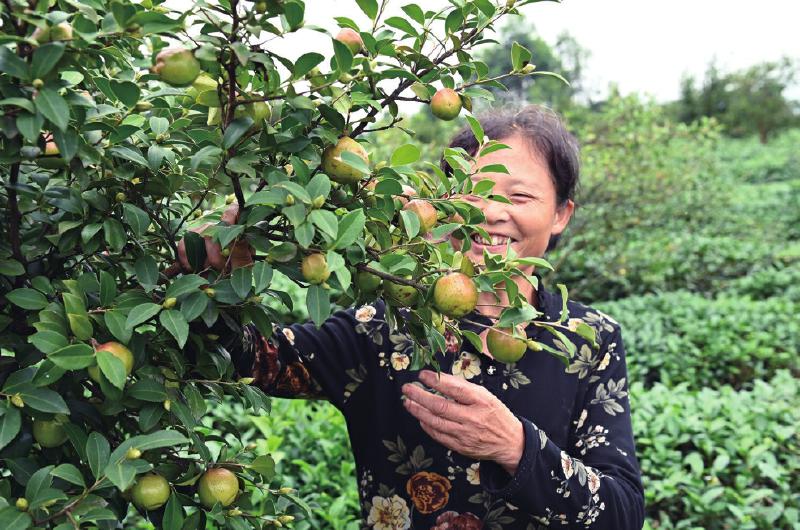 在村民肖菊华那片茶叶、油茶套种的地里,她正撩起一根油茶枝条数着数,枝条上结了大大小小21颗果实,整棵树大约有300多颗果实。近年来,肖菊华采取茶叶套种油茶的模式,实现了一地双收目标。“去年,卖了600多斤晒干的油茶籽,收入近5000元,另外还自留了200多斤干油茶籽榨油68斤。”肖菊华高兴地说。