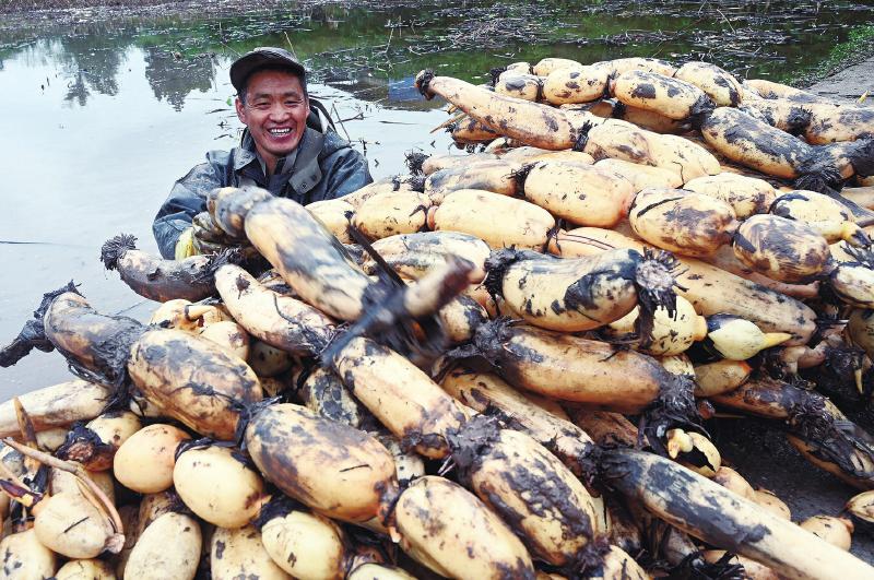 丰收时节,藕农抢抓农时加紧采挖、清洗、分拣新鲜的莲藕,准备供应市场。