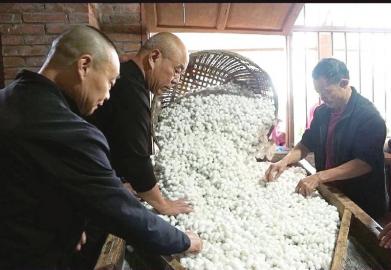 “年纪大了,出门打工难。在这里采茧子,一天能挣几十上百元,老板还包接送。”村民唐明菊一边利落地按质分装蚕茧,一边说。她口中的“老板”,是新兴家庭农场负责人廖素珍。