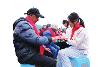 暖心点位广安市广安区恒升镇代龙村 10月27日,广安市广安区恒升镇代龙村举行了“金秋重阳 情暖桑榆”尊老敬老主题活动。 活动中,青年志愿者和少先队员为代龙村的老人包饺子、熬鱼汤、理发、剪指甲、义诊、表演节目、发放御寒红围巾,陪伴老人吃坝坝席,传承优良传统。图为少先队员在为该村老人剪指甲。杜捷 周尚进 特约通讯员 廖小兵摄影报道