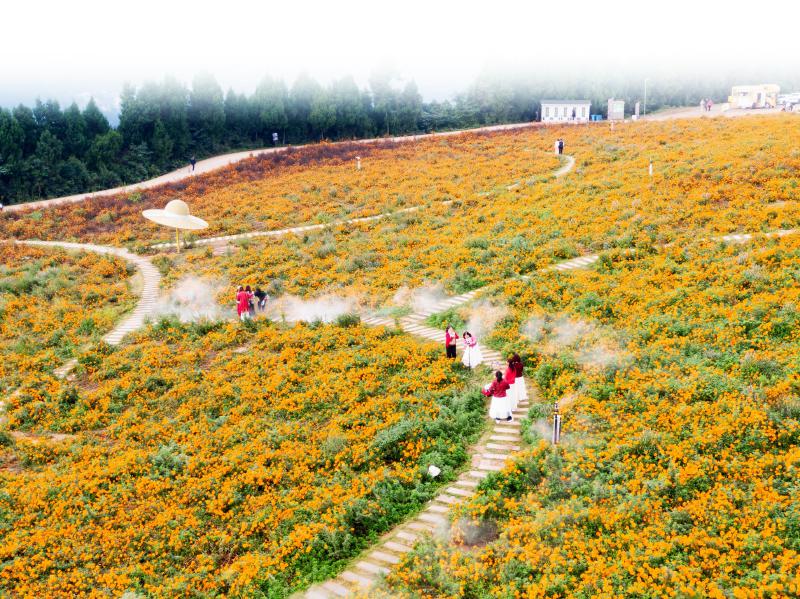 10月27日,游客在德阳市旌阳区双东镇金锣桥村的万寿菊花海里游玩。