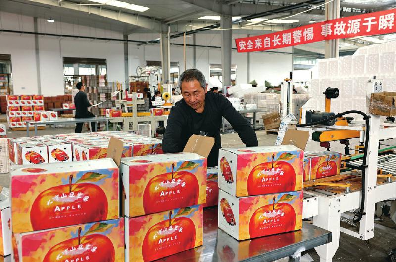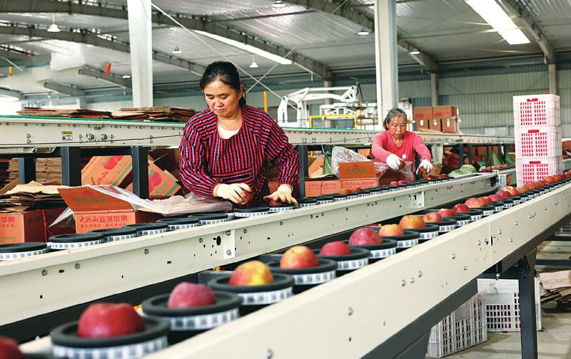 10月28日,在眉山市东坡区尚义镇一水果物流交易配送中心,工人在苹果传送线上忙碌。 东坡区建成集“仓储、冷链、加工、分拣”等功能于一体的水果物流交易配送中心,对采收的水果进行标准化处理,既增强了市场竞争力,又带动村民在家门口就业增收。 特约通讯员 姚永亮 摄