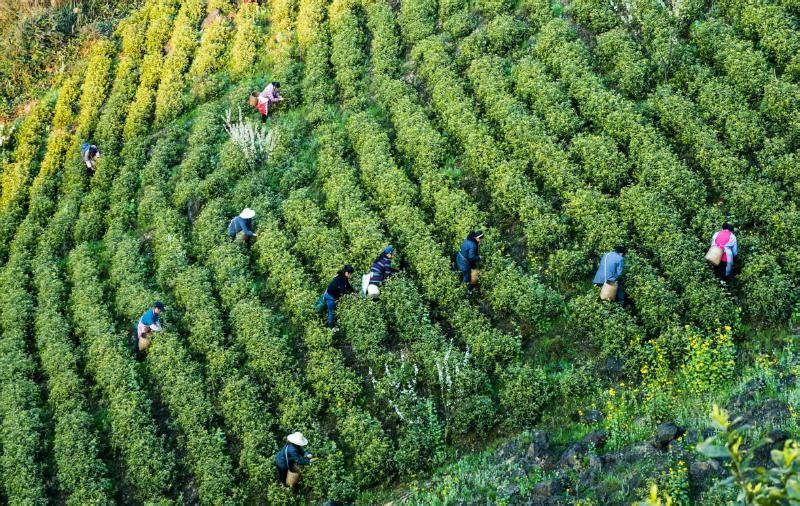 晨曦中的高山茶园,在光影中演绎别样的诗情画意。 五彩斑驳的筠连大地上,秋茶是最动人的那一抹绿。 天气晴好,茶农在辛勤地采摘秋茶。 俯瞰秋茶园。 在青翠的茶园里,采摘秋茶的人们像珍珠一样熠熠生辉。