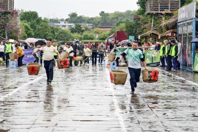 11月2日,泸州市合江县第十届运动会丰收接力赛在尧坝古镇举行。全县18个镇(街)代表队参加了“独轮车运稻谷”“挑柚子”“背红苕”“扛玉米”等项目,一决高下。