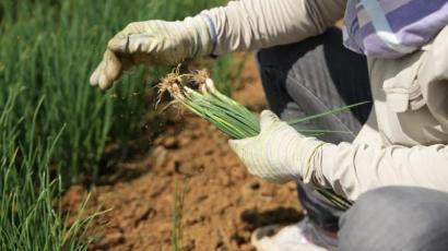 这片丰产葱田,过去因干热气候和沙质土壤,种植传统作物效益很低。今年初,福田镇党委、政府牵线,探索“村集体+企业”合作运营模式,即村集体以土地和资金入股占45%,企业负责技术、种苗和销售,占股55%。针对沙质土特性,基地引进了耐贫瘠的白杆小葱,配套水肥一体化系统,45天到60天就能采收,全年可收 5 次,亩产达 4000斤。