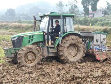 随后,记者搭乘王贵斌的“拖板鞋”(当地方言,指小货车)来到其在罗江区白马关镇海棠村的基地。一辆100马力的拖拉机早已整装待发,王贵斌迅速钻入驾驶室,操纵着这辆拖拉机牵引着播种器,在泥泞的田里如履平地,播下一粒粒麦种。