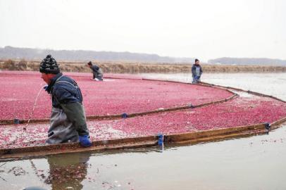 11月6日,在抚远市蔓越莓种植基地,工作人员在水中采收蔓越莓。