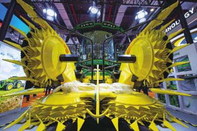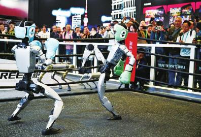 ①11月6日,在第八届进博会宇树科技展台,人形机器人进行格斗表演。 ② 11 月 7日在第八届进博会创新孵化专区拍摄的家庭陪伴机器人。 ③11月5日,人们在第八届进博会国家展中国馆观看溯光仿生鲨1.5展品。 ④11月6日,在第八届进博会技术装备展区拍摄的自走式青贮收获机。 ⑤11月8日,在第八届进博会消费品展区,观众在乔山健康科技展台参与体能挑战。