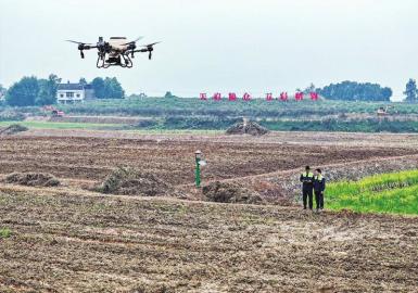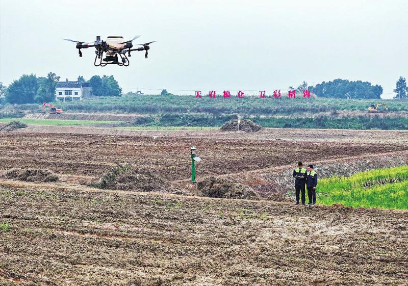 11月12日,华蓥市华龙街道东方村村民用无人机,为刚收割完水稻的农田播种油菜。