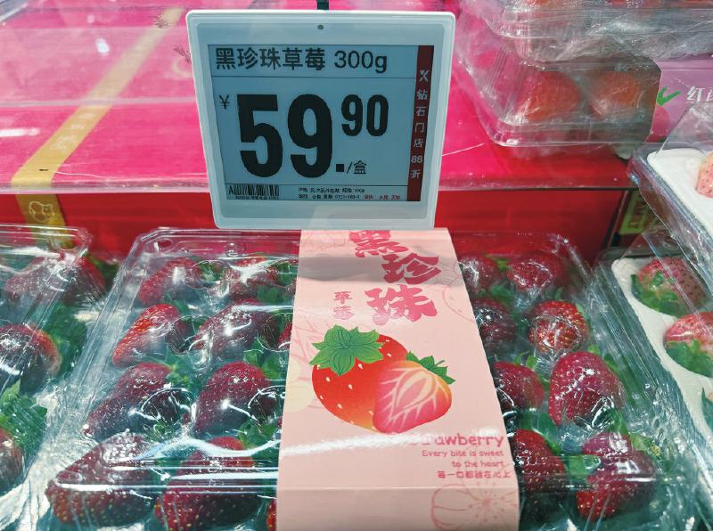 盒马鲜生超市内,“黑珍珠”草莓以300克/盒的规格售卖,标价59.9元。