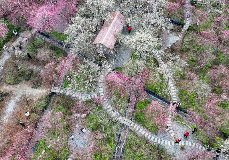 2 月 1 日,华蓥市禄市镇凉水村生态园里,红梅、白梅、绿萼梅等相继绽放,把乡村装点得生机盎然,如诗如画,吸引不少市民前往赏花打卡,迎接新春。