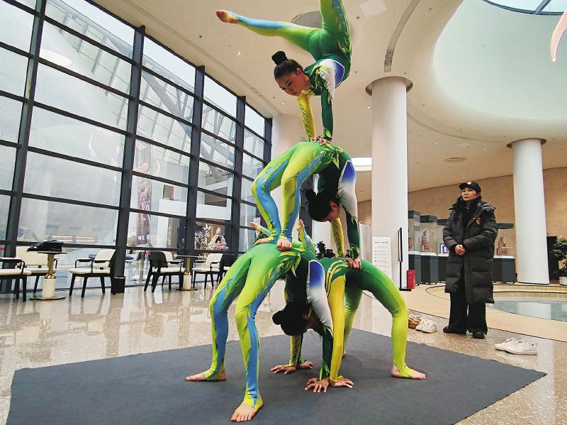 在展示中心的大厅里,自贡市杂技团的演员们正抓紧排练。她们在垫子上反复练习类似叠罗汉的造型“四元宝”、依托肩部或腰部提供支撑的“肩腰顶”等高难动作,为节目做准备。演员们以身体相互支撑,“叠罗汉”的造型缓缓升起,每一次托举与平衡都力求精准而沉稳。