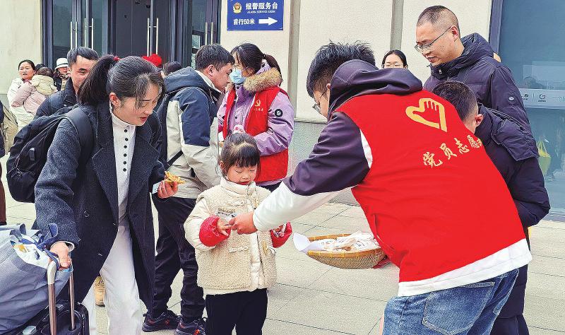 中午时分,西成高铁青川站迎来返乡客流高峰。站前广场上,身穿红马甲的党员志愿者忙碌穿梭,为返乡农民工提供引导和帮助。刚下车的旅客不仅品尝到“面花花”“非遗黄酒”等家乡味道,还可现场了解招聘信息——40 余个工种、2000 余个岗位虚位以待。工作人员同步登记返乡人员需求,向流动党员征集发展建议,并发放装有围巾、手套、帽子的“暖冬礼包”。随后,返乡人员在工作人员指引下,免费乘坐专车直达家门。